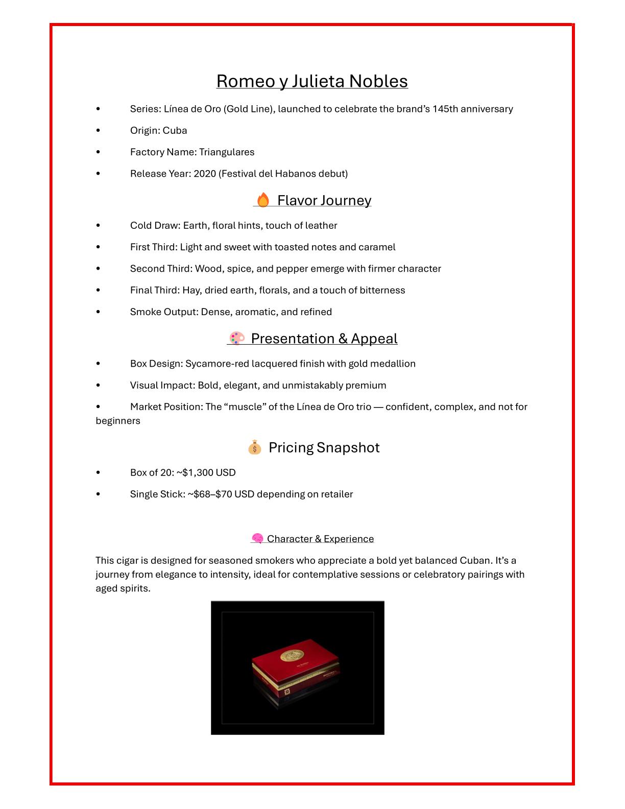 Like the Cuban Montecristo Línea 1935 or the Cohiba Behike before that, the Romeo y Julieta Línea de Oro is meant to be a super-premium, Gran Cru version of an already premium brand. In this case, the tobaccos in the Línea de Oro are stronger than those found in the core Romeo y Julieta line. The sizes are new, and the prices certainly reflect the super-premium category. To emphasize the brand’s exclusivity, the boxes are quite opulent, made of glossy red sycamore with an embossed medallion. This line comes in only three sizes but the star was Nobles, a fat belicoso full of dried fruit flavor that gradually intensifies to a strong, oaky and leathery finish.